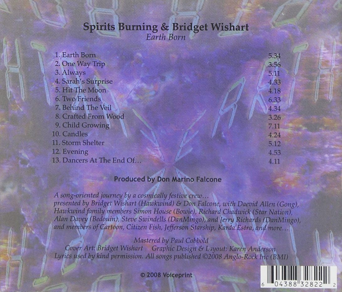 Repressing. 2008 album from Space Rock collective Spirits Burning and vocalist Bridget Wishart (best known as the only female singer for Hawkwind). Earth Born is Space Rock via mellow, Psychedelic tunefulness, thru to a Bristol sound reminiscent of Massive Attack and including a melodic sensuous Kate Bush/Peter Gabriel feel.