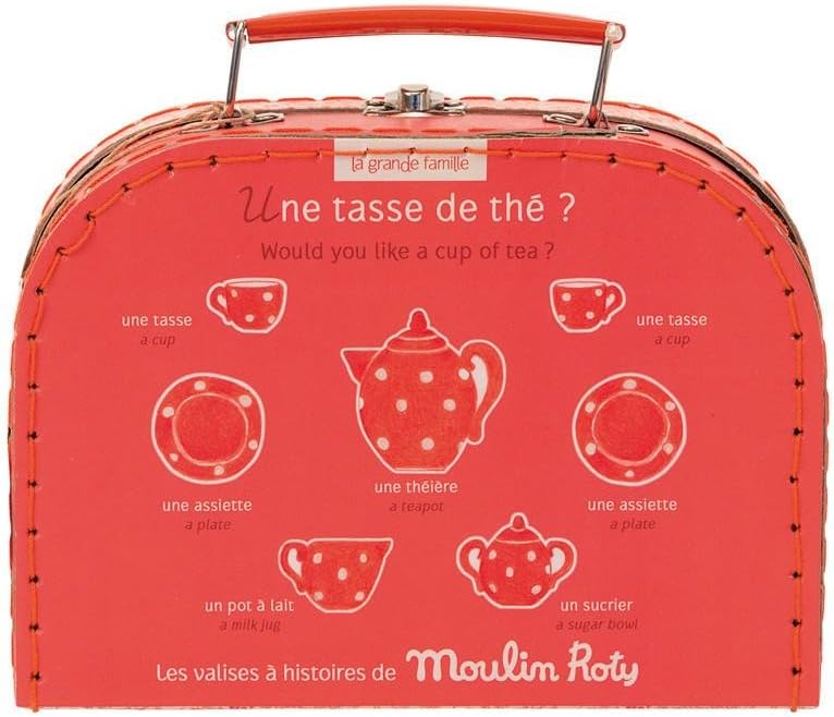 It's time for tea! Your little one can make pretend tea with this cute, red and white polka-dot ceramic tea set. The tea set comes in an illustrated carrying case, with illustrations of Nini the Mouse, Jeanne the Duck and Sylvain the Rabbit enjoying tea and cake.