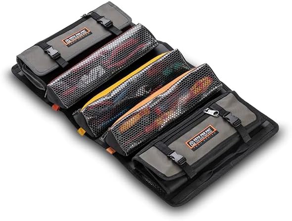 The TR-LC is a highly functional, large modular tool roll designed for job sites and roadside repairs. It features a mountable design with a hanging hook to keep it off the ground and out of the mud. This large tool roll is easily carried with an ergonomic grip handle and a shoulder strap when rolled up, and two secondary handles for quick transport when unrolled. The TR-LC includes five removable storage pouches and rolls: three multi-colored large bulk storage pouches (“RP-LCs”) designed to contain items while hanging; a wrench roll (“WR-LC”) for a full wrench set, and a socket roll (“SR-LC”) for a full socket set. Both the WR-LC and SR-LC also function as standalone rolls with external zippered pockets and carrying handles. The RP-LCs, WR-LC, and SR-LC utilize heavy duty Velcro to ensure a secure attachment and easy detachment on the inside of the TR-LC so that you can grab them and go as you need. Additional WR-LCs, SR-LCs, and a 2-Pac of RP-LCs (shown as RP-LC (2 PAC) and offering different colors (dark gray and light gray) than the RP-LCs that come with the TR-LC) can be purchased separately to customize the layout.